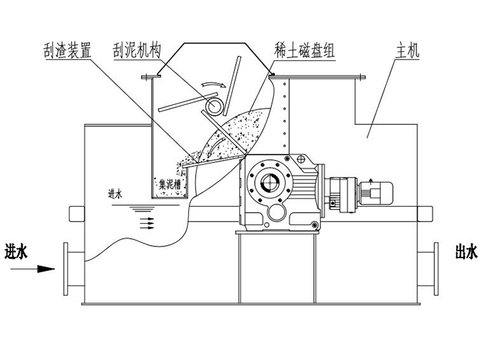 超磁分离净化设备是由一组强磁力稀土磁盘打捞分离机械组成。如图所示,当污水流经磁盘组之间的流道时,水中所含的磁性悬浮絮团受到磁场力的作用,吸附在磁盘盘面上,随着磁盘的转动,迅速从水体中分离出来。运转到刮渣装置时,形成隔磁卸渣带,由刮泥机构刮入排泥槽,卸载的污泥流入磁分离磁鼓。泥水分离后清水从出水口流出,完成净化过程。