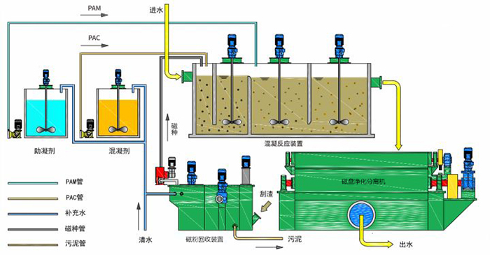 磁分离净化水处理系统工艺技术具有稳定成熟、分离时间短、处理能力大等特点。